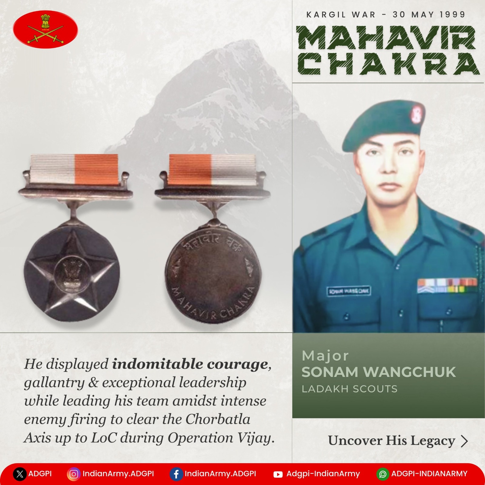 During the Kargil conflict, Col. Wangchuk displayed exceptional courage and tactical brilliance in extreme high-altitude warfare conditions. His ability to motivate troops and lead from the front under hostile circumstances set a benchmark in military leadership.