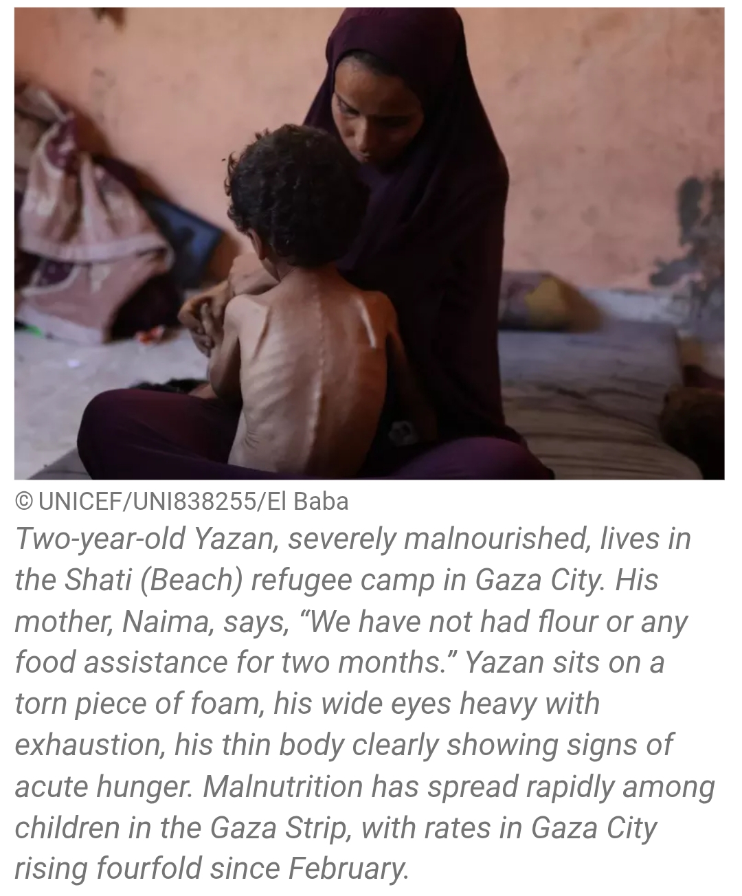 “This is the deadliest form of hunger, and we are seeing it increase at an alarming rate,” said UNICEF Executive Director Catherine Russell. “We need immediate, safe and unhindered humanitarian access across Gaza… Without it, parents will remain powerless to save their children from a condition we know how to treat and prevent.”
